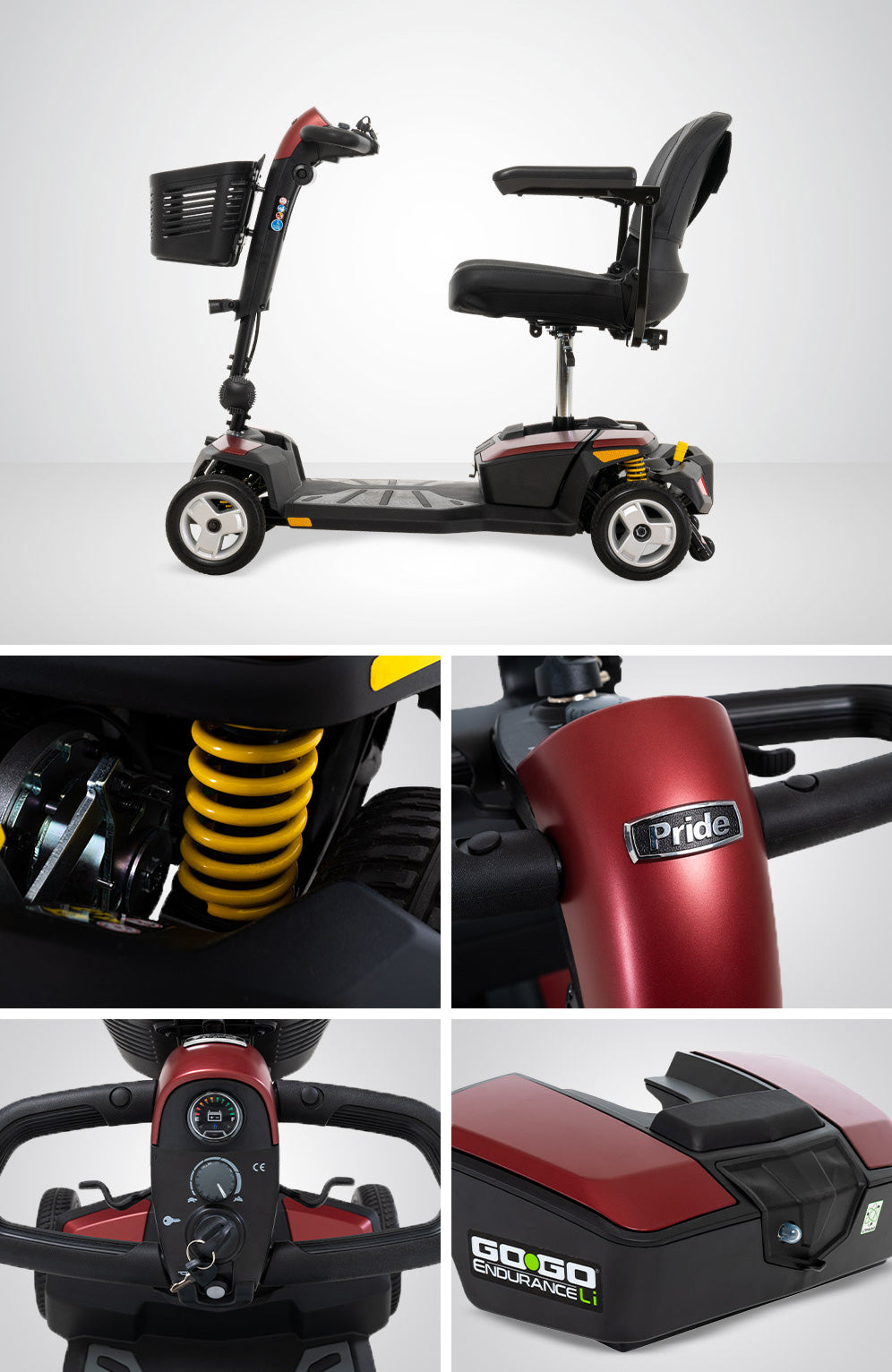 Battery performance defines the Go Go® Endurance Li Mobility Scooter. With lithium technology, you’ll charge your batteries faster, achieve longer battery life, and experience greater reliability from one of Pride’s most popular mobility scooter lineups.